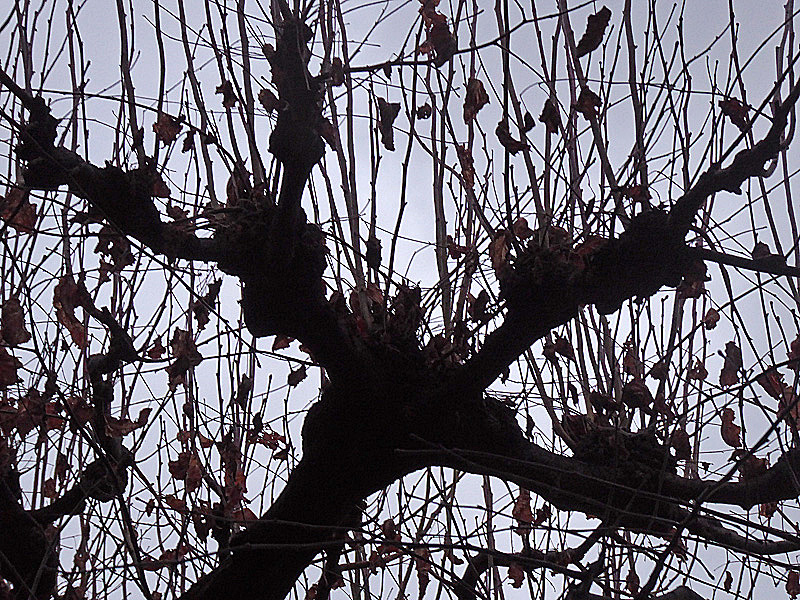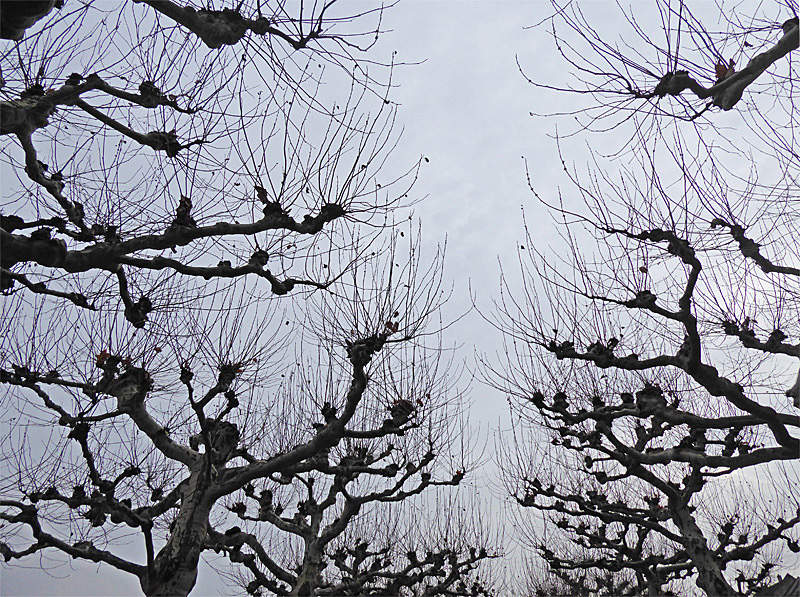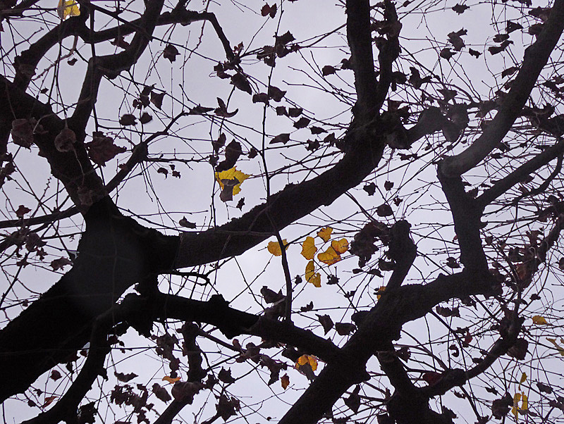 Ein blauer Himmel mag schön und gefällig sein, aber aus fotografischer Perspektive finde ich ihn manchmal auch uninteressant. Die knorrigen Platanenästen und die Reste an bunten Blättern, die daran noch zu sehen waren, bringt ein verhangener Spätnachmittaghimmel meiner Meinung nach viel besser zur Geltung.
