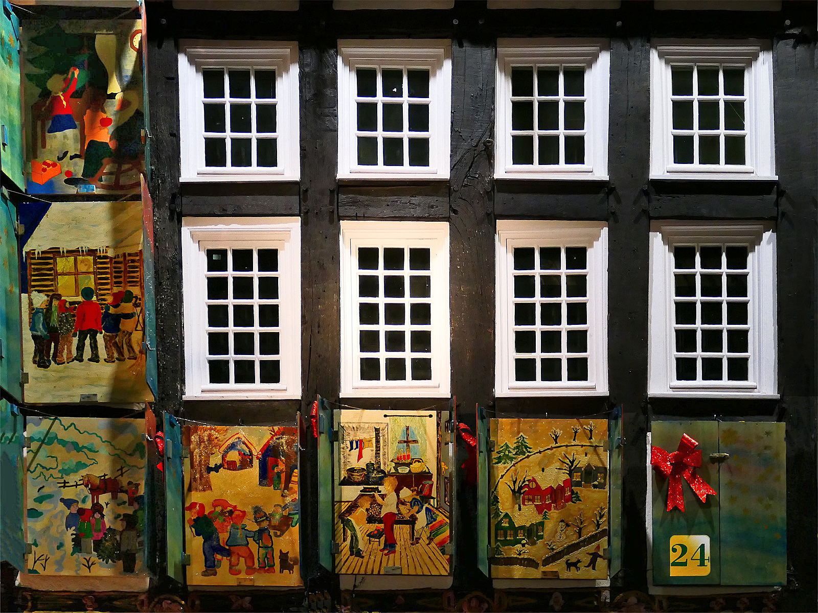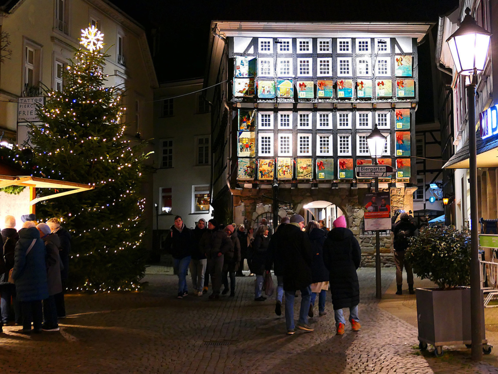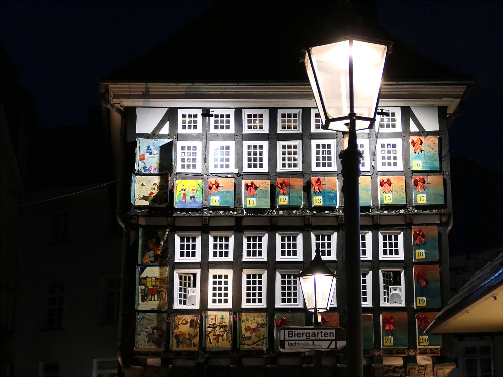 In der Adventszeit sind bis zum 24. Dezember die Fenster des Alten Rathauses am Untermarkt mit weihnachtlich bemalten Täfelchen verziert. Das Rathaus ist dann ein riesiger Adventskalender. Jeden Tag ab dem 1. Dezember öffnet Frau Holle täglich um 17.00 Uhr in ihrem märchenhaften Kostüm vor den erwartungsvoll wartenden Kindern eines der Fenster des historischen Fachwerkhauses und beglückt die wartende Menge mit Geschichten und Gesang. Ganz ehrlich: Es war zu der Zeit so brechend voll auf dem Untermarkt, dass ich das Weite gesucht habe. Die Fotos sind deutlich später am Abend entstanden.