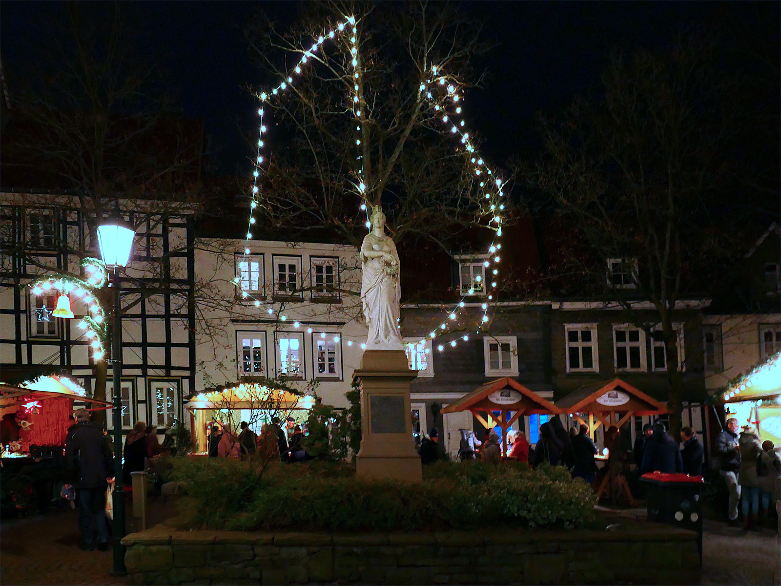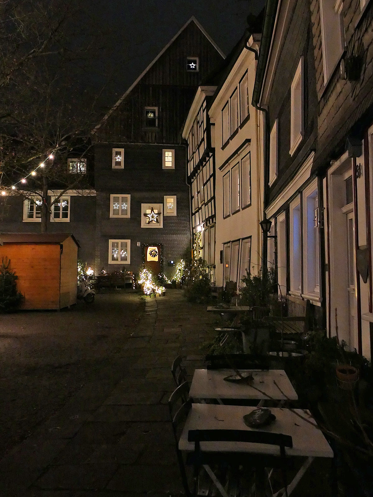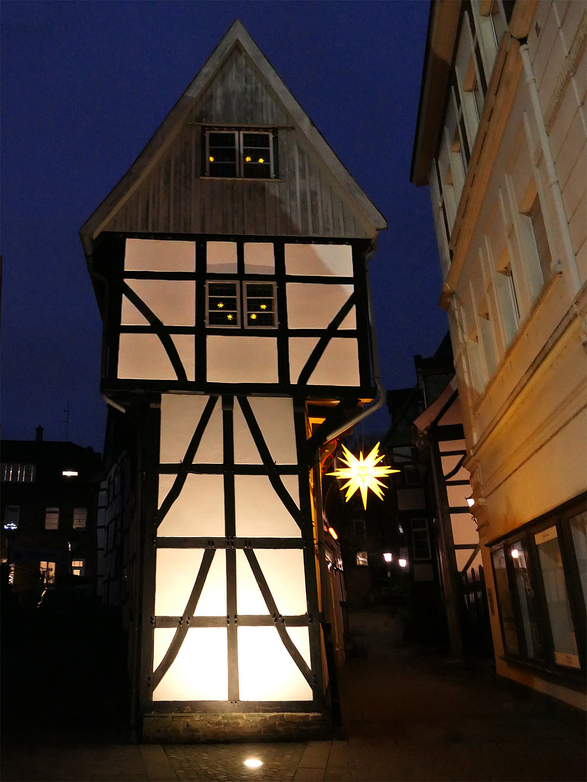 In der Adventszeit sind bis zum 24. Dezember die Fenster des Alten Rathauses am Untermarkt mit weihnachtlich bemalten Täfelchen verziert. Das Rathaus ist dann ein riesiger Adventskalender. Jeden Tag ab dem 1. Dezember öffnet Frau Holle täglich um 17.00 Uhr in ihrem märchenhaften Kostüm vor den erwartungsvoll wartenden Kindern eines der Fenster des historischen Fachwerkhauses und beglückt die wartende Menge mit Geschichten und Gesang. Ganz ehrlich: Es war zu der Zeit so brechend voll auf dem Untermarkt, dass ich das Weite gesucht habe. Die Fotos sind deutlich später am Abend entstanden.
