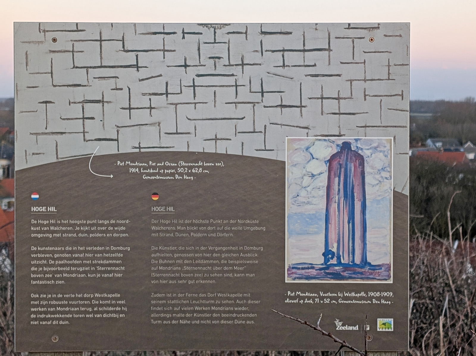 Oben auf dem Hoge Hill wird auch auf ein bestimmtes Werk von Mondrian hingewiesen: Als er 1908 für zwei Wochen in Domburg war, konzentrierte er sich u.a. auf das Malen des Leuchtturms von Westkapelle.