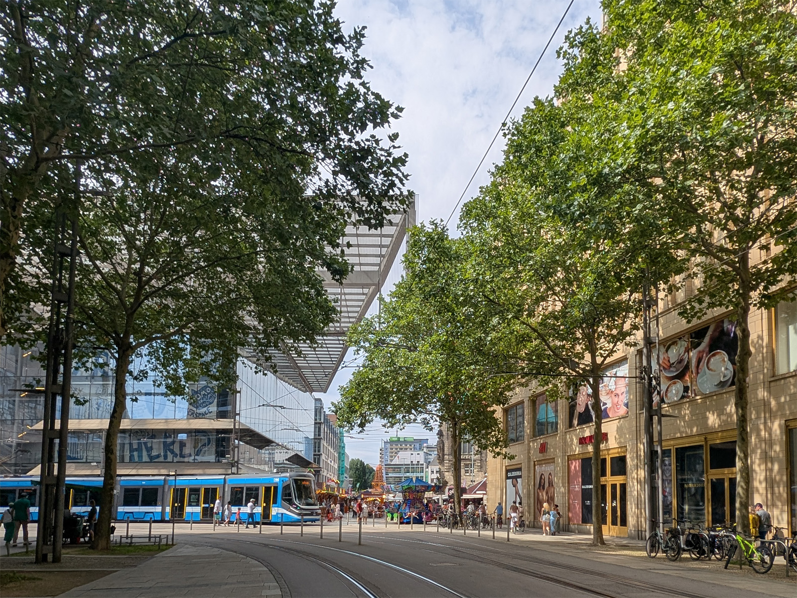 Hinter dem ehemaligen Galeria-Glasbau geht rechts noch eine zentrale Straße ab: die Rathausstraße – mit einigen Geschäften und Imbissen, vor allem aber mit der Zentralhaltestelle der Bahnen. Am Ende der Straße erreicht man den Hbf.