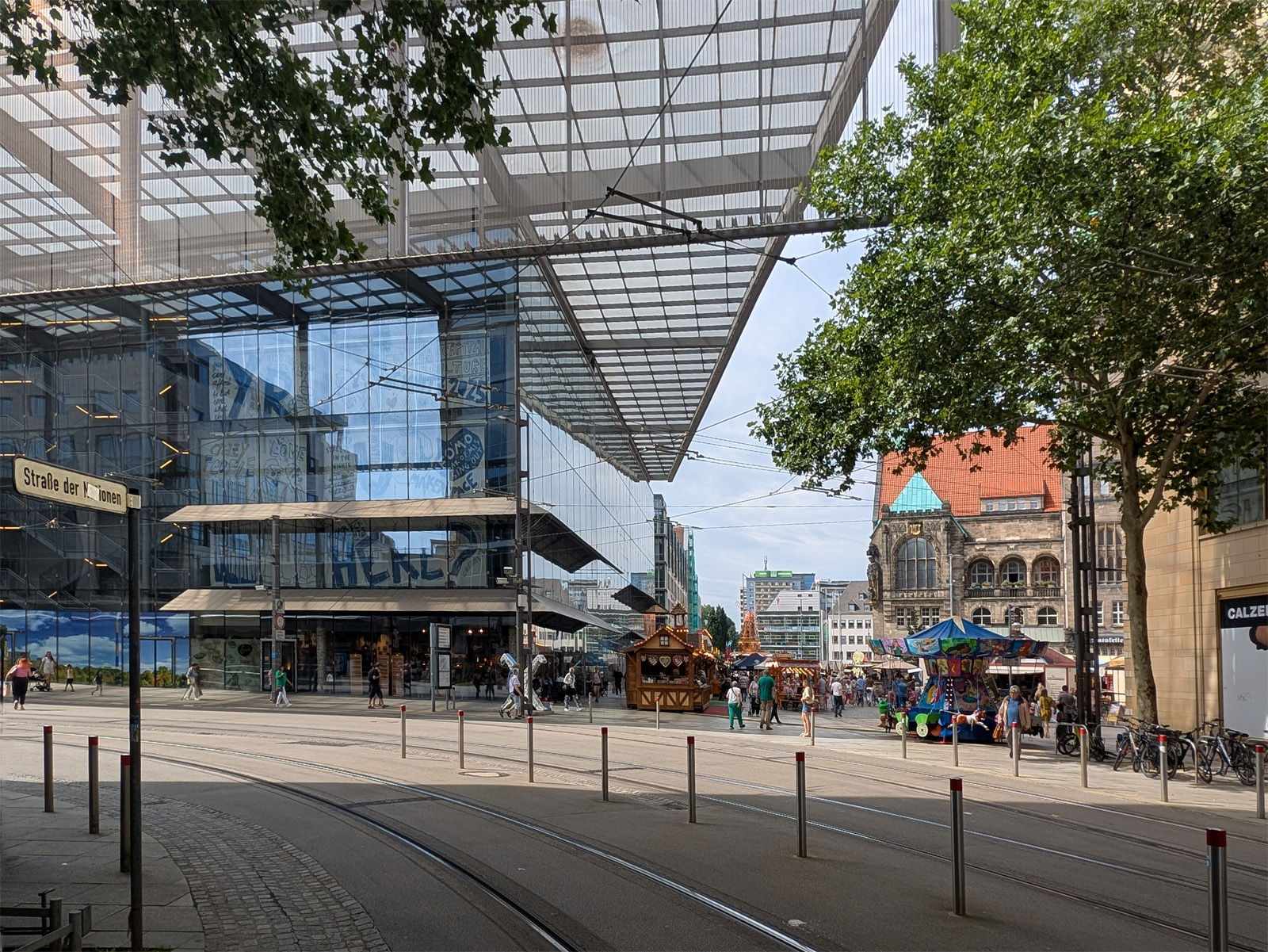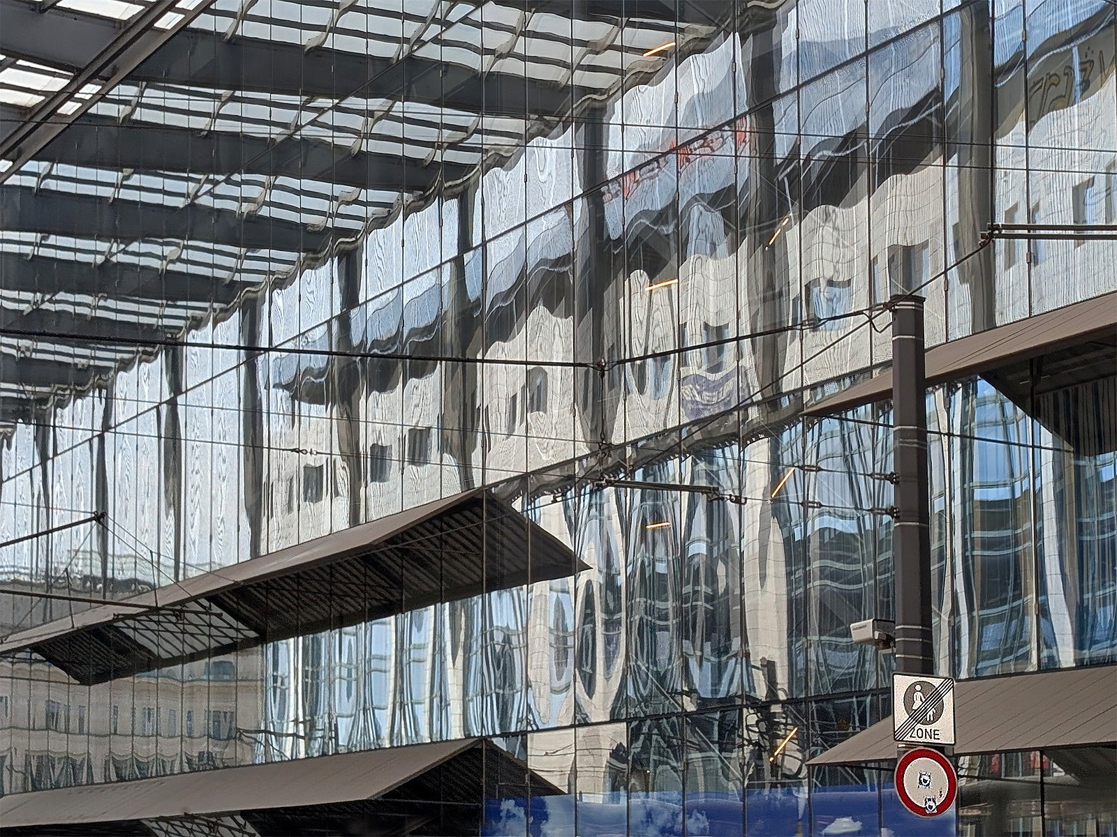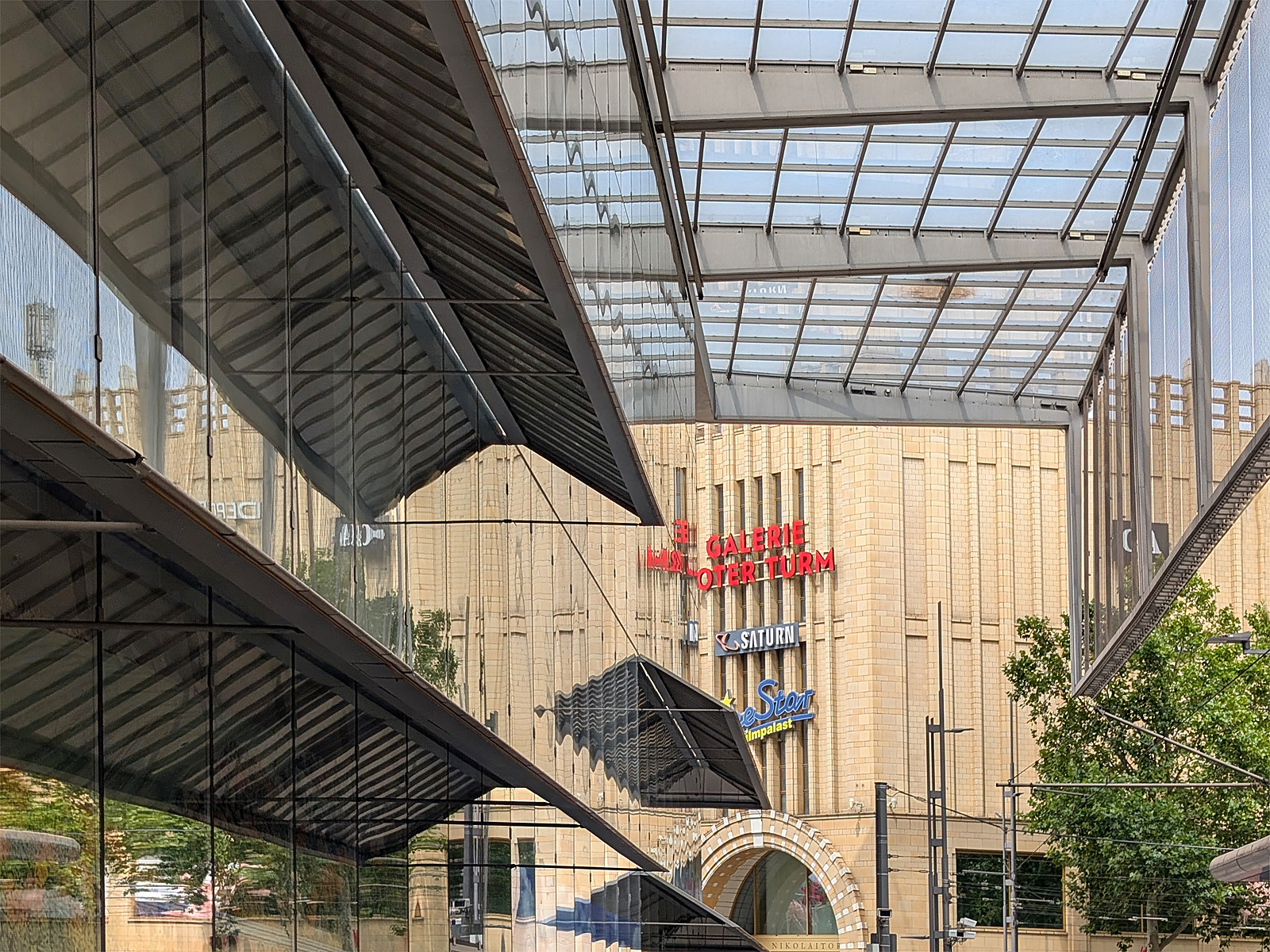 Die Spiegelungen durch die Glasfassade des ehemaligen Kaufhauses werden hier noch ganz enorm verstärkt durch Überdachungen – ebenfalls aus Glas.