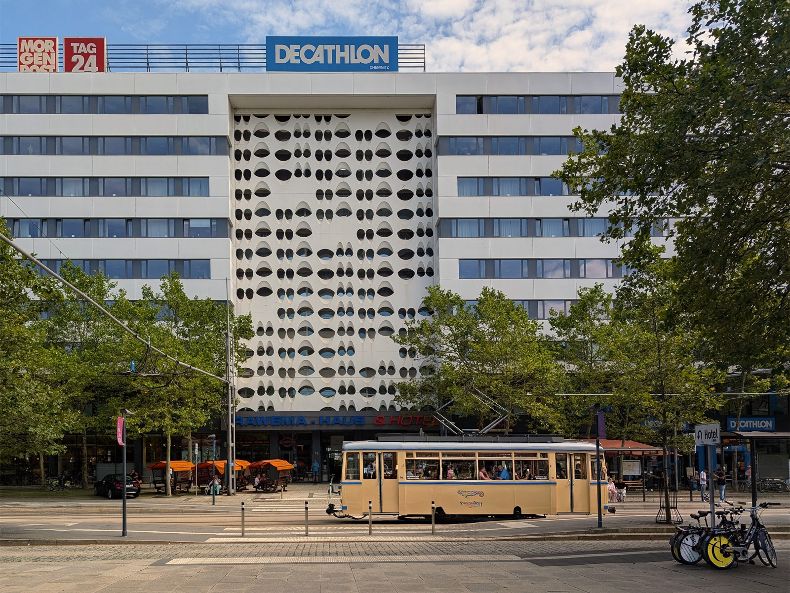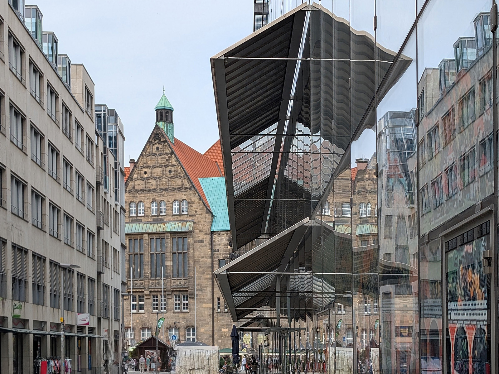 Gegenüber dem Einkaufszentrum ein Glaspalast – leider im Moment hauptsächlich leerstehend. Galeria Kaufhof schloss dort 2024 seinen Standort in Chemnitz. Jetzt sollen wohl Verwaltungen der Stadt dort einziehen. Von den reizvollen Spiegelfächen des Gebäudes wird noch die Rede sein.