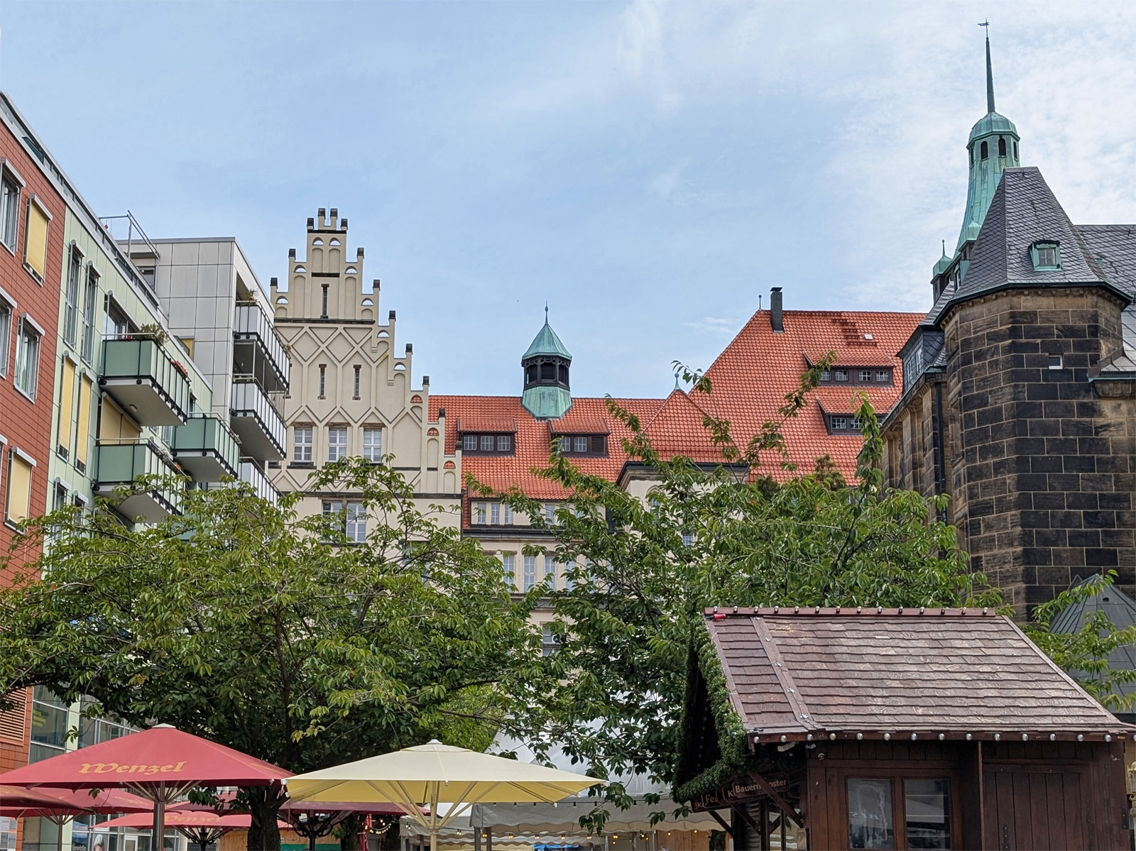Das Neue Rathaus (1911) grenzt direkt an das spätgotische Alte Rathaus (1496-1498). Hier wird gerne geheiratet, auch bei unserem Besuch. Diese Gebäude wurden ebenfalls beim Bombenangriff 1945 maßgeblich zerstört. In unmittelbarer Umgebung gibt es noch einige nach der Bombardierung verbliebene, gut restaurierte Altstadthäuser – leider nur eine Handvoll.