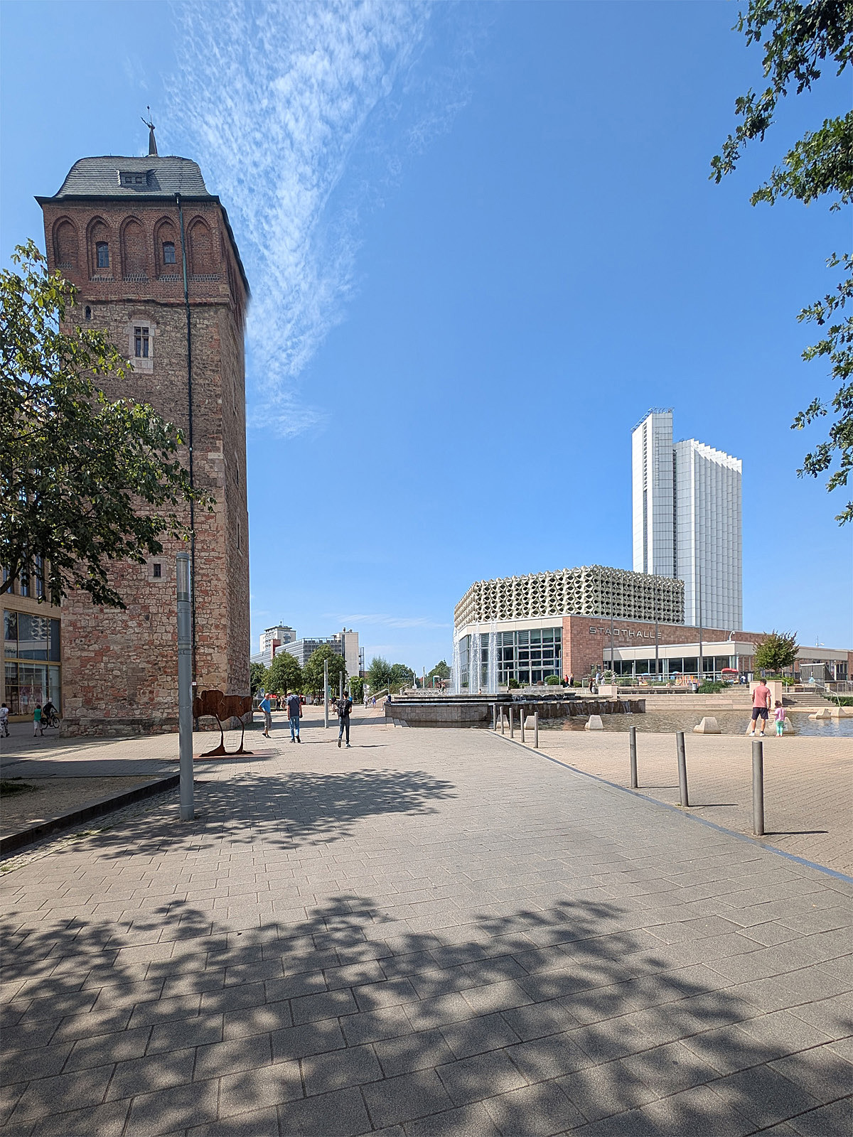 Von unserem Parkplatz unweit einer der wichtigsten Sehenswürdigkeiten der Stadt, von der gesondert im nächsten Beitrag die Rede sein wird, erreichte man schnell das Hochhaus des Congress Hotels und durch eine Parkanlage den Roten Turm, das älteste Bauwerk der Stadt.