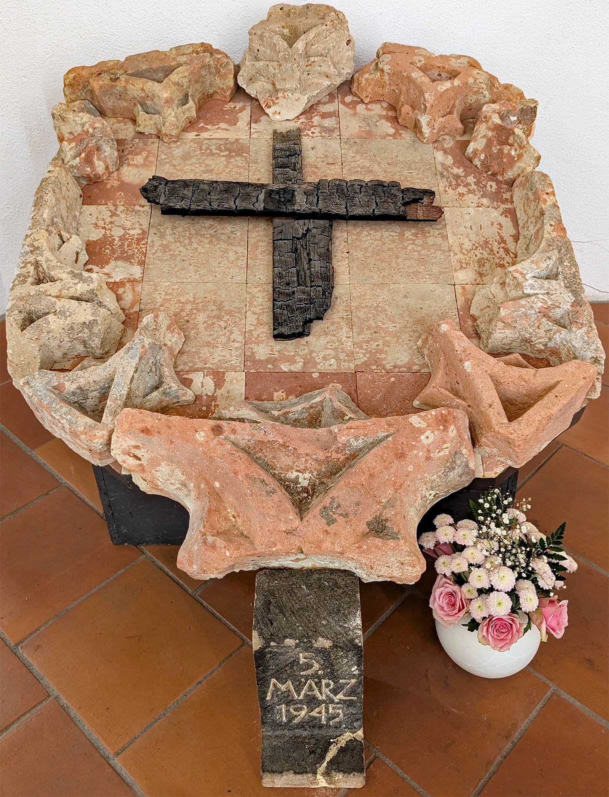 Gedenkstein mit bei der Bombardierung der Kirche verbrannten und verkohlten Resten eines Kreuzes