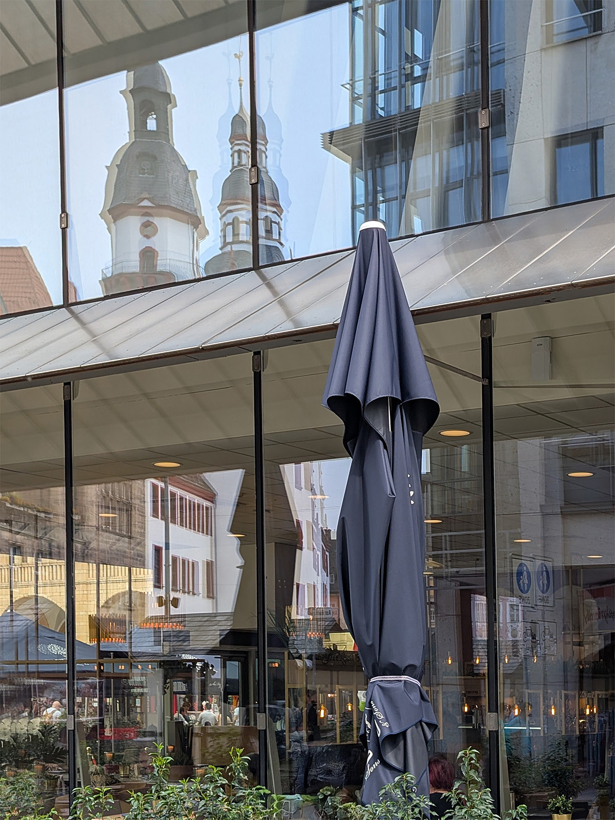 Weinfestbuden erlebte ich als undankbares Motiv – aber die Spiegelungen der Buden in der monumentalen Glasfassade des leerstehenden Galeria-Gebäudes haben mich fasziniert.
