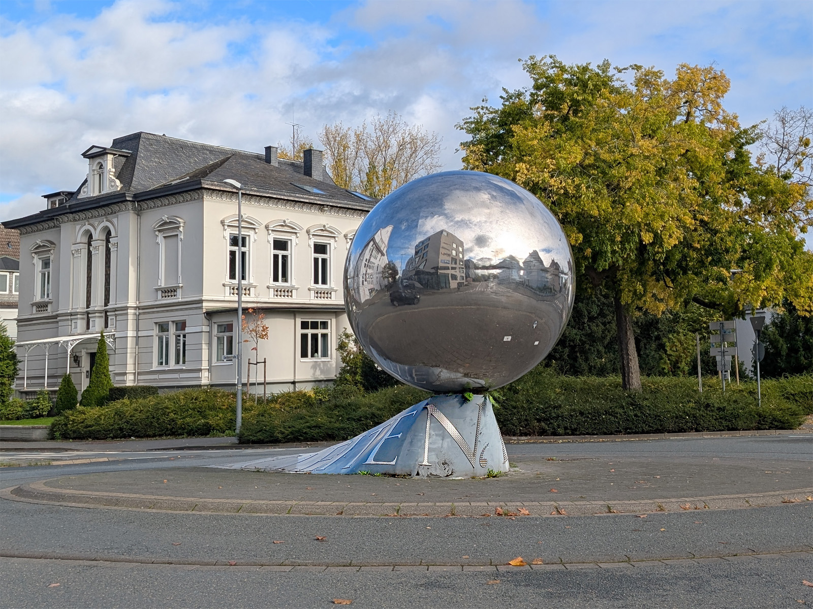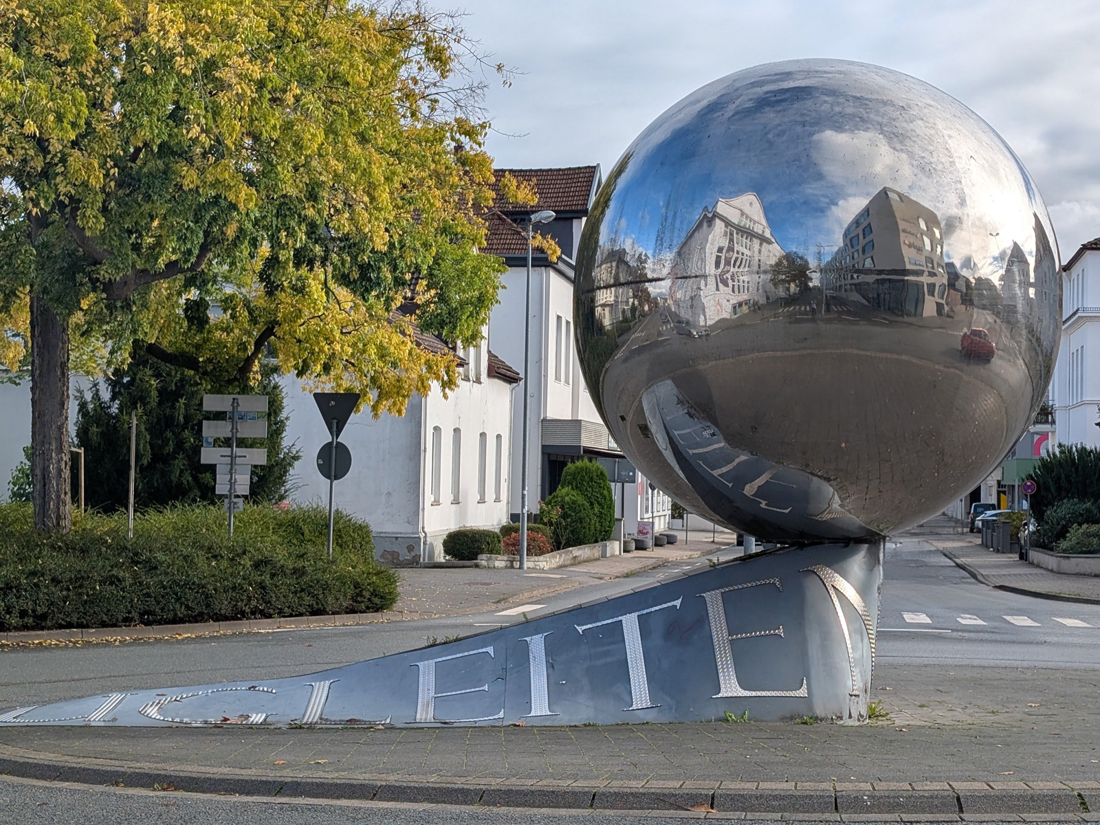 Auf dem Rückweg haben wir uns noch die Skulptur – La Palla (der Ball) – angesehen, die am Anfang der Goebenstraße steht, die zu Marta führt. Von ihr geht ein Textband aus, das auch dort wieder endet. Die Schlaufe ist 135 m – also insgesamt 270 m – lang. Auf ihr zu lesen ist ein Gedicht von Rainer Maria Rilke – auch mit dem Titel “Der Ball”.