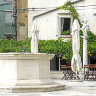 Piran, Portodomo Square: römische Statue vor venetianischen Häusern
